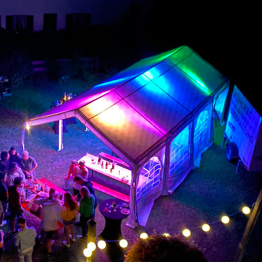 Überdachte Fläche: 32 qm, Platz für max. 60 Personen, Bestuhlung mit bis zu 6 Biertischgarnituren möglich, 100% wasserdichtes PVC-Dach 500g/qm, inklusive aller Wände, optional abnehmbar