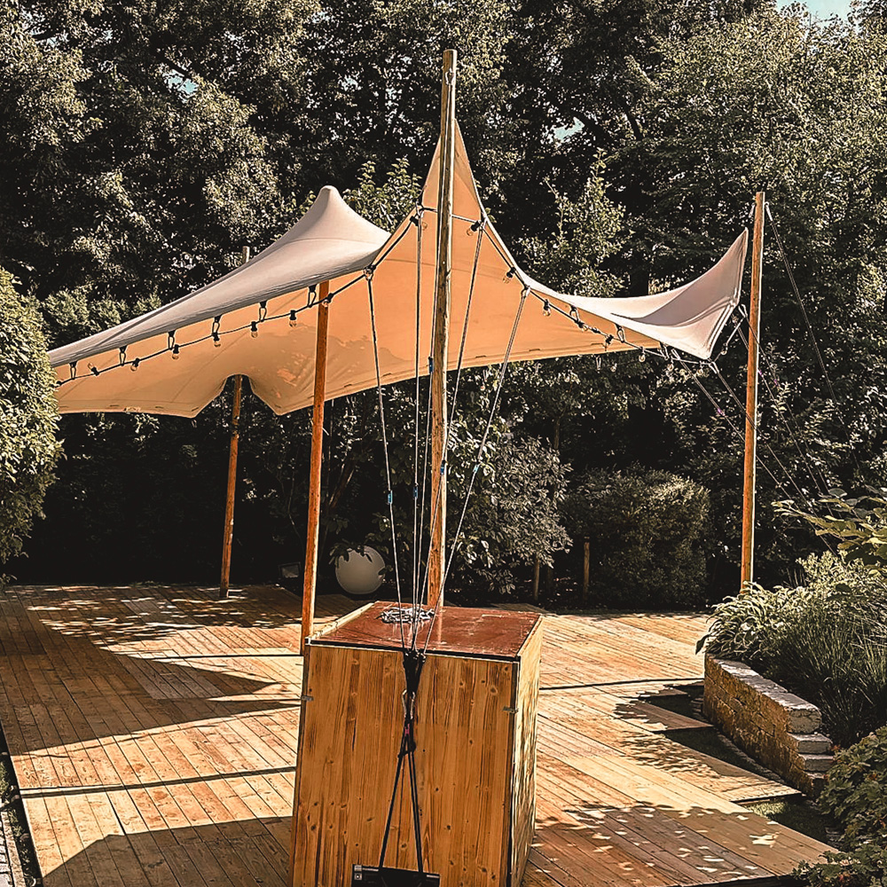 WICHTIG: Das zelt braucht um seine Grundfläche herum ca. 2m Freifläche um 1m lange Erdnägel zur Verankerung des Zeltes einzuschlagen. Der Kunde ist für überraschende Schäden oder Mehraufwand bei ungeklärten Untergrund verantwortlich.